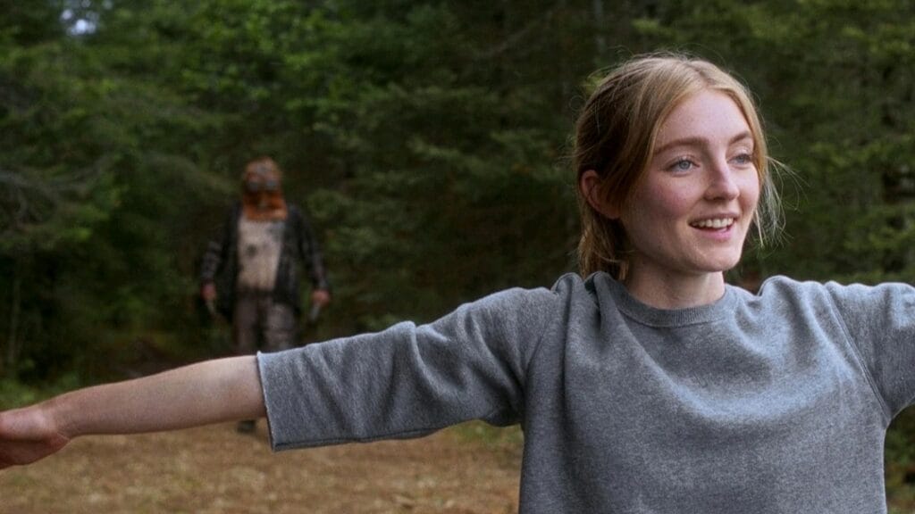 Johnny rarely shows any emotion, and the few times when he does seem angry or vindictive may very well be the result of projection on the viewer’s part. He slashes methodically, unhurriedly. The only sounds are diegetic (with ingenious sound design from Michelle Hwu and Tim Atkins). If other people are close enough that we the observers can hear their conversations, jokes and snippets of chitchat fade in and out, or we hear their whispered warnings to each other once they realize how dangerous these woods are. Beyond that, we only hear the sounds of the forest: chirping birds, rustling leaves, Johnny’s plodding footsteps, and occasionally Johnny’s weapons entering the campers’ bodies.